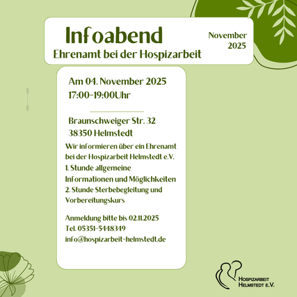 Infoabend Ehrenamt Dienstag, 4. November 2025 · 17–19 Uhr Hospizbüro, Braunschweiger Straße 32, Helmstedt Anmeldung: 05351-5448349 · info@hospizarbeit-helmstedt.de